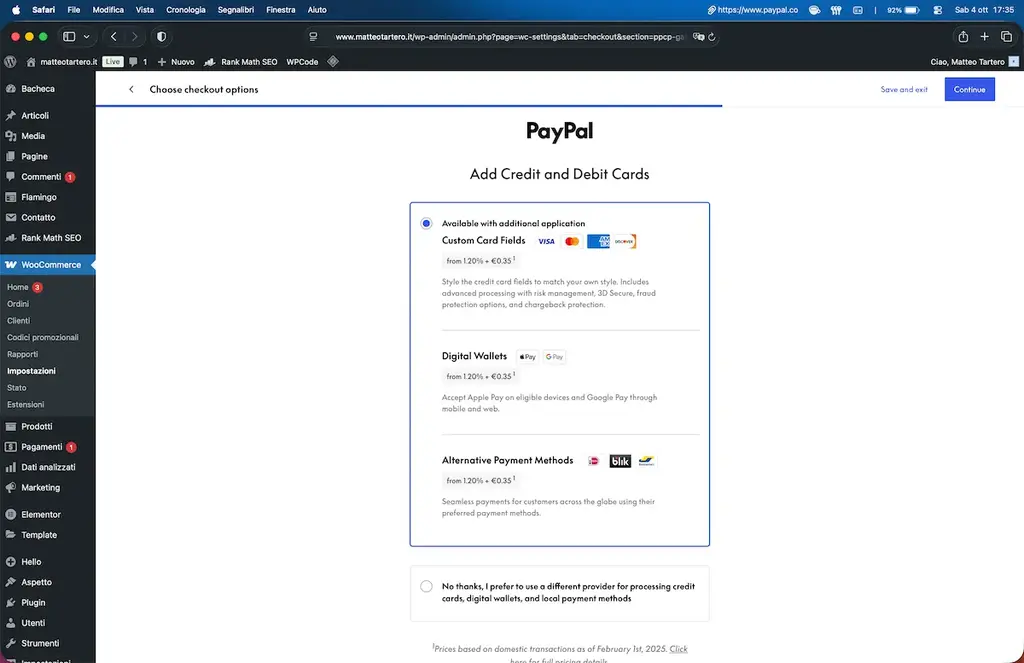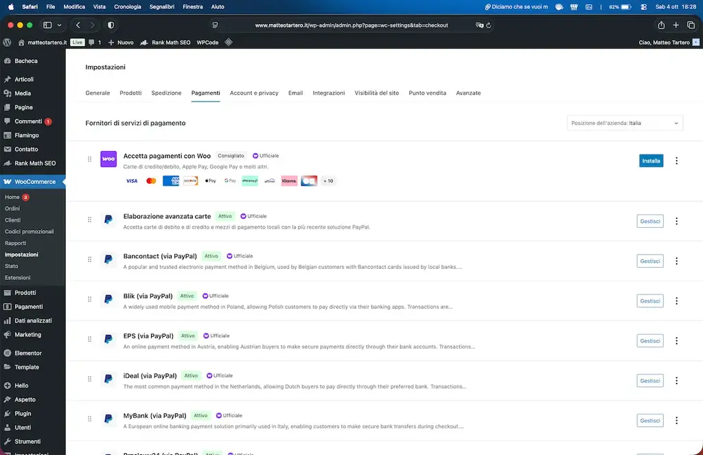 In pratica con un solo plugin permetterai all’utente di poter pagare tramite il conto PayPal oppure direttamente con la sua carta di debito o credito. All’appello dei metodi di pagamento diffusi manca solo Satispay, per il quale esiste un plugin apposta per l’integrazione su WooCommerce.