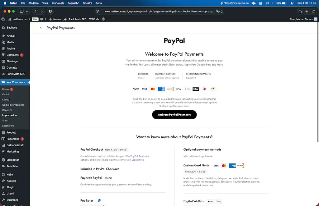 La configurazione guidata è molto semplice e alla portata di tutti. Per iniziare basta premere su Activate PayPal Payment.