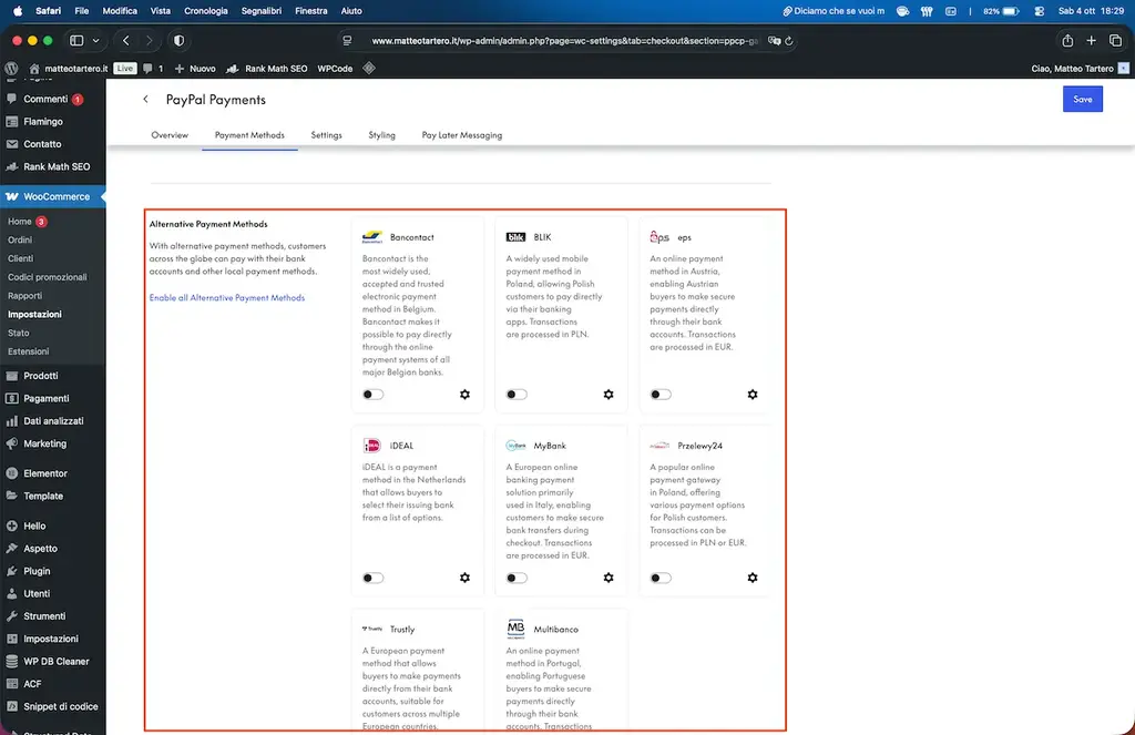 Per prima cosa, se non vendi all’estero, disabilita i circuiti di pagamenti stranieri. Sono circuiti di pagamenti, pagonabili al nostro Bancomat, ma di altri paesi europei. Li trovi sulla scheda Payment Methods.