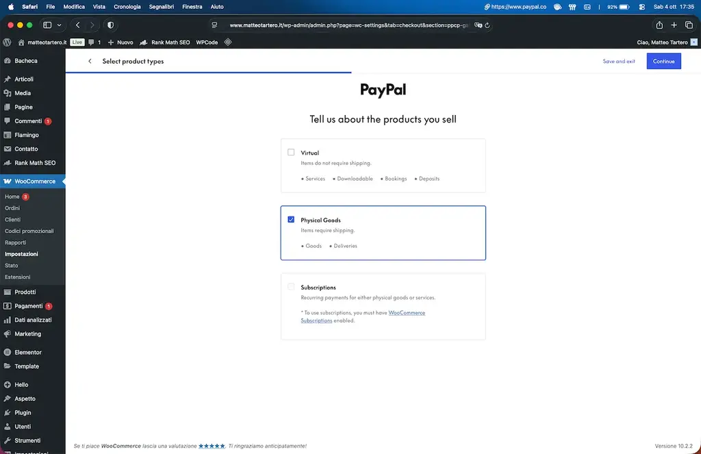 Nelle schermate successive ti verrà chiesto di selezionare il conto Business, i tipi di prodotti venduti, se Virtual (virtuali), Physical Goods (prodotti fisici) o a Subscription (sottoscrizione di servizi). Infine ti verrà chiesto di selezionare PayPal come hub di pagamento per le carte di credito o di debito.